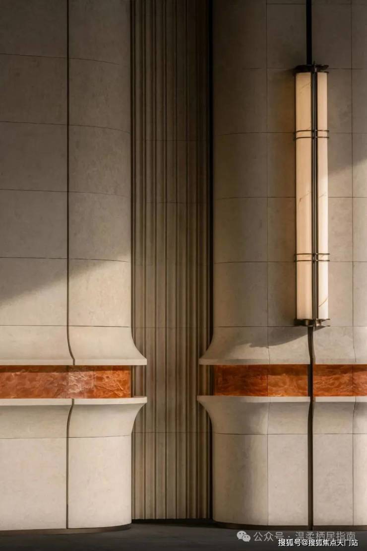 顶部定制发光云石亚克力与圆弧形的古铜色铝板交相辉映,8个西班牙宫殿沉香米黄石柱提升了尊崇感 ,漫步其间,揽风入怀,树影斑驳映入眼帘,水声潺潺入耳,归家的轻松感油然而生,笔者随手一拍,都非常的出圈。
