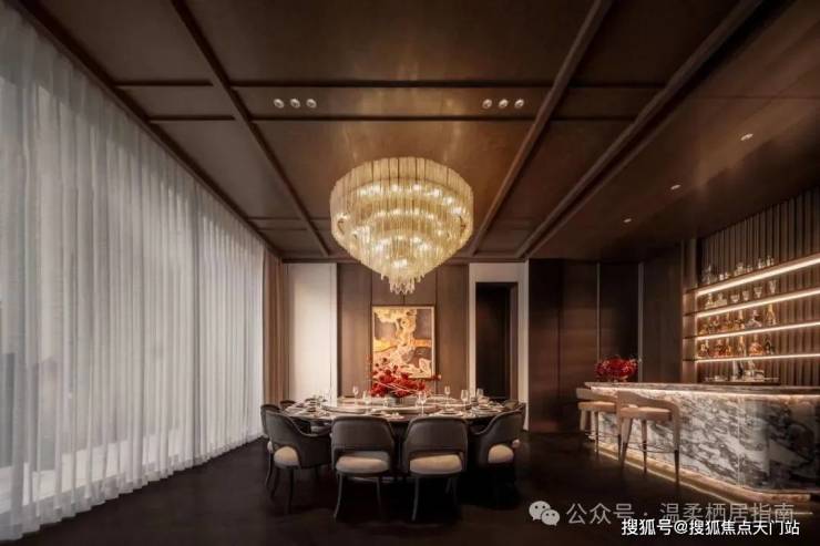 而业主专享的私宴厅则是将 “尊贵感”说到了极致! 臻选奢石营造雅致屏风,墙上大师匠呈繁花艺作,定制灯具璀璨生辉,摩登意蕴充盈其中,匹配大人物品位。除了敞阔的就餐空间,还独立配置吧台、品茗休息区。暮色四合,华灯初上,谈笑风生中展现风雅从容,觥筹交错间皆是繁华丰茂。