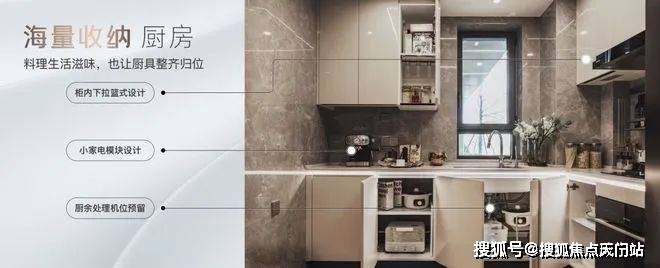 橱柜收纳系统:特别预置洗碗机点位、柜内下拉篮式设计、不锈钢挡油板、柜下操作灯、烹饪全流程功能动线一体化设计;