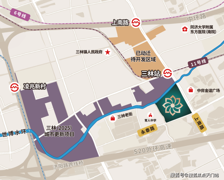 项目坐落于浦东三林板块,隶属上海“十四五”规划中的金色中环发展带,与前滩仅隔一条中环路,地铁11号线三林站直线距离约200米,步行可达,1站直达前滩核心,2站抵达徐汇滨江,轨交通勤优势显著。