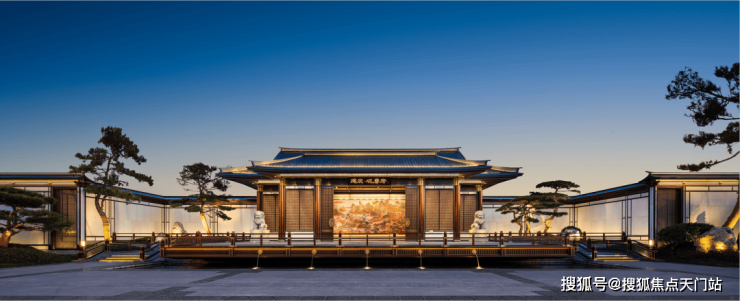 入境观唐,尺度威仪的唐风大门,面宽约40米,高约9.6米,屋顶采用“重檐歇山顶”形式,彰显中式门第尊崇之礼。