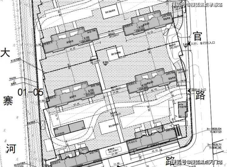 01-03(中间),规划10幢楼,其中一幢为保障房,总高17-18-20层,小区中心位置的商品一楼为架空层,南北楼间距30米。