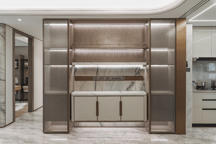 在交付配套之中 高阶定制餐柜空间,提供更多收纳空间之外,也增加空间视觉层次。