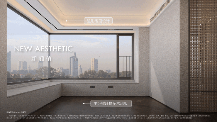 项目大量使用奢石设计,客厅 四边弧形天花 、主卧 树叶拼花地板 、精致优雅的 骨骼线设计 ,都是开发商花费更大成本和耗材去呈现更美的视觉体验。