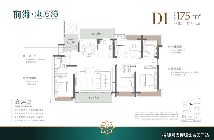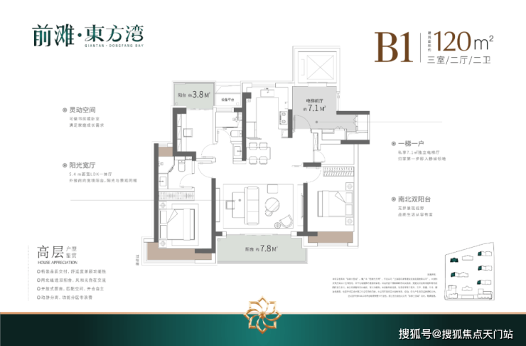 户型建筑层高3.1-3.15米,无连廊,双阳台配置。其中建面约103平户型2梯2户,其余一梯一户。