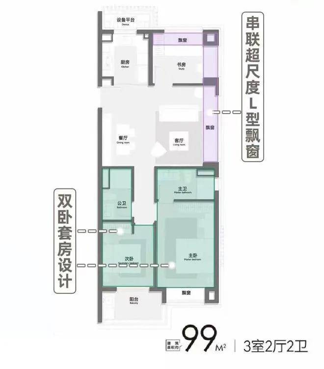 并基于均好性之上进行升级,如主力产品建面约99㎡三房户型,一共推出约200套房,得房率做到了约76-79%,远高于市场近零能耗建筑普遍水准。在户型空间上,客餐厨一体化设计,降低走道带来的空间浪费之余,为家庭交互提供全新场景,将空间最大化利用;全卧飘窗/阳台设计,无论是采光还是通风全部表现优秀,还提升使用面积;主卧套房设计,进一步提升私密性与舒适性。