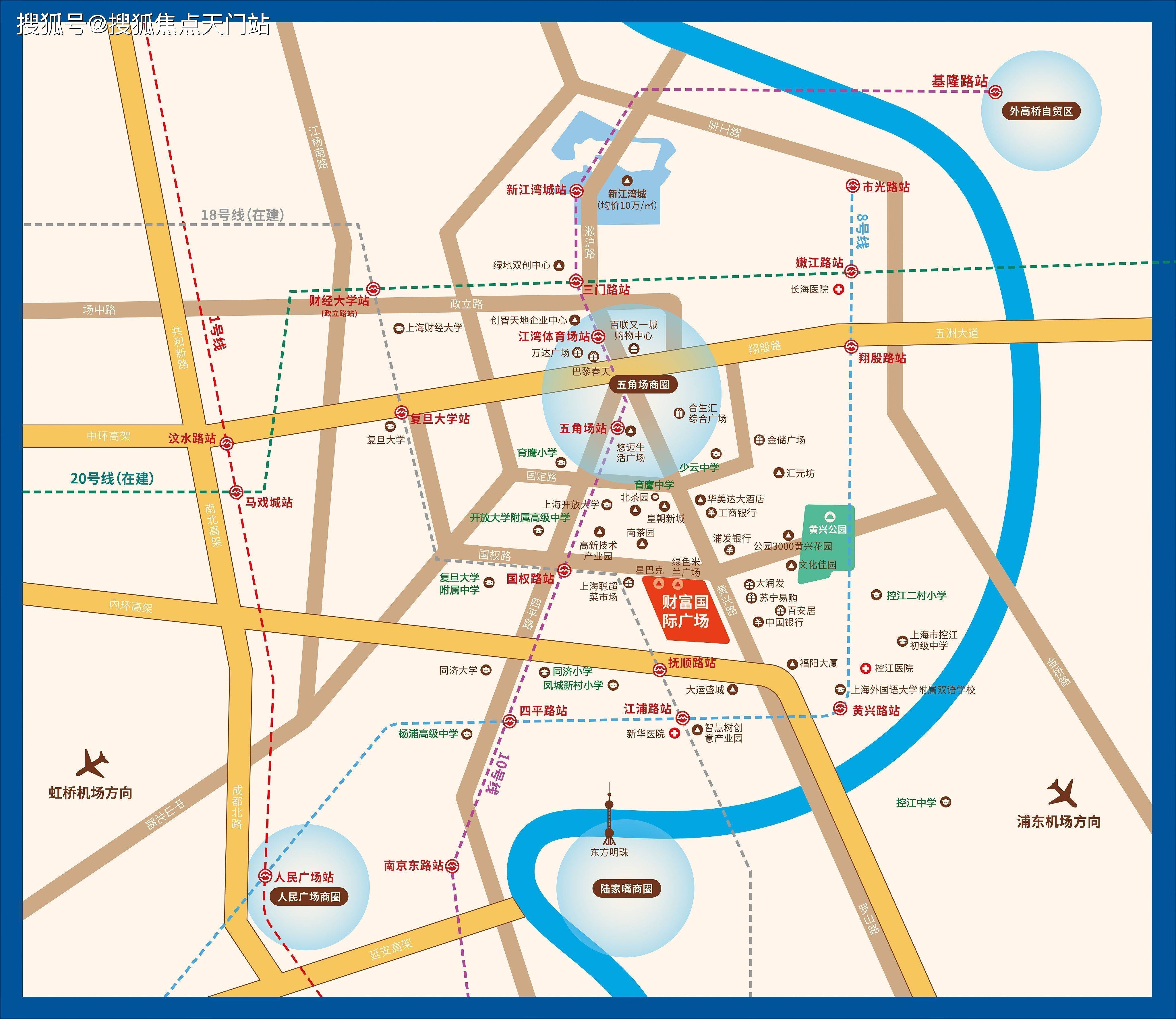 财富国际广场(金座)位于杨浦区国权路39号,汇锦里(王座)位于杨浦区国权路49、51号,东望黄兴路,依附于上海市五大副中心之一的五角场商圈。