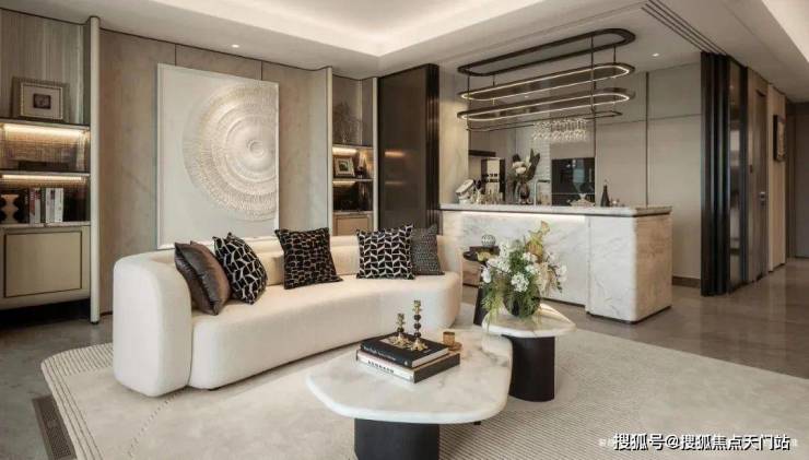 客厅背景墙的“烟雨江南”天然大理石,不同于传统平面背景墙,通过弧度及立体的造型处理,并镶嵌不锈钢材质,对于金茂而言,比奢石昂贵的,是让奢石真正与空间气场融为一体。