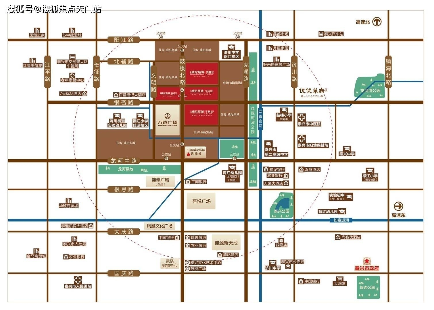 随着泰兴城北百亿规划纷纷落地,铸就泰兴城北新商业中芯的诞生。商业驱动区域繁华,聚焦万达广场、吾悦广场两大商业综合体,衣食住行应有尽有,凤凰文化广场(即将开业)、迎幸广场(在建),也将为此地再添活力。优教资源汇聚于此,包括济川街道实验幼儿园、襟江小学、济川中学等。城北围绕“一园一主题、一路一特色、一河一风貌”提升绿化水平,打造“双河双绿核”景观区域,龙河湾城市公园、泰兴公园、滨河公园,系统打造绿化河道风光带。新中医院和妇幼保健院也落地城北,银行、酒店、公交等基础配套健全。随着城北百亿规划全面推进,届时城北片区将形成商业繁华、人文精致、功能完善、配套齐全的城市生态宜居板块。