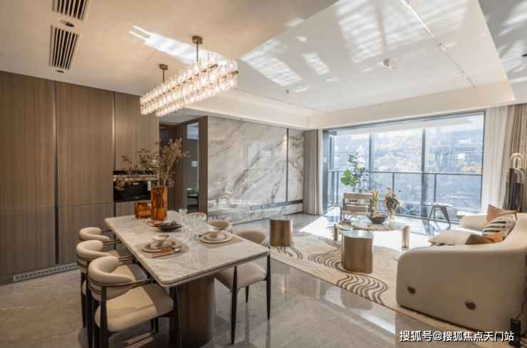 整体大面宽客厅,以岩板背景墙作为点缀装饰,弧形吊顶,造型别致,空间品质大幅提升: