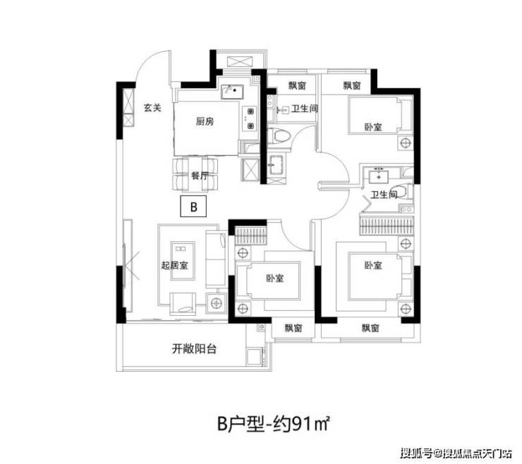 建面约91㎡3房2卫,三开间朝南,客餐厅连通大阳台, 四飘窗设计,好户型该有的素质它都有。