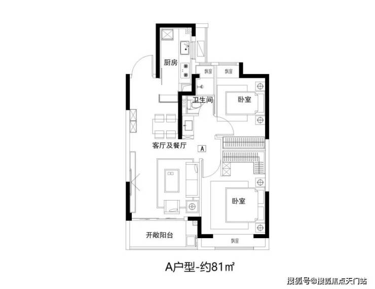 建面约81㎡2房功能齐全,拥有朝南大面宽和全卧飘窗设计。