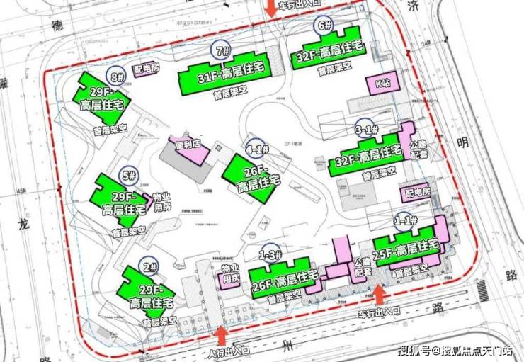 项目地面无车位,全人车分流,主要出入口位于南侧德州路,车行出入口分别位于德州路、济明路、德恒路;所有住宅楼栋首层全架空,设置有大面积的下沉式庭院、地下会所以及风雨连廊!