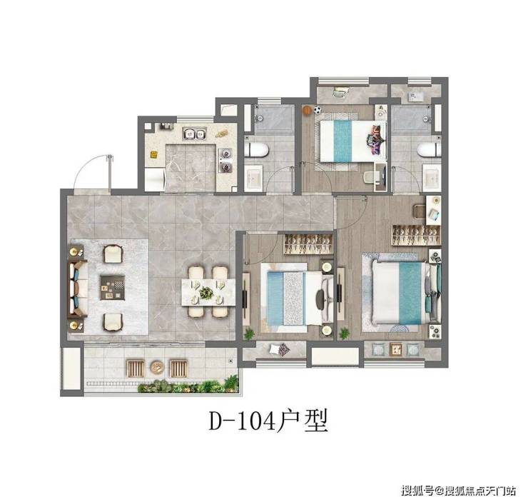 建筑面积约104㎡的3房户型,四开间朝南+主卧套房设计+全卧室带飘窗+南北通透+超大的宽面阳台,做出了拥有120㎡以上户型的尺度感和舒适度。如果预算合适,这个户型绝对推荐。
