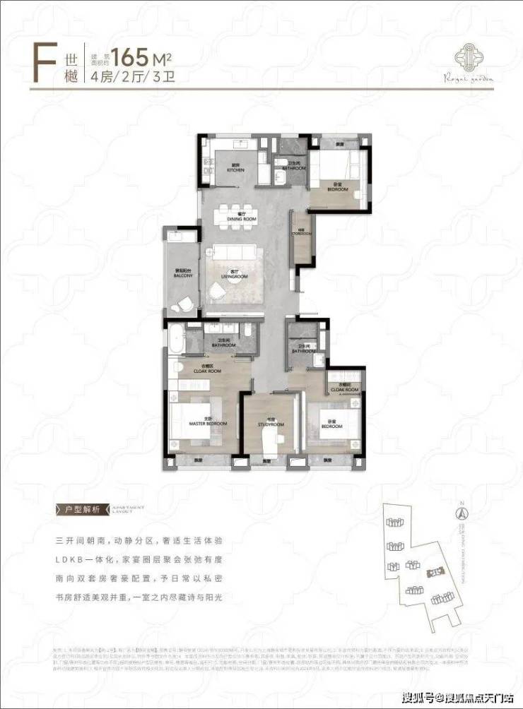 104㎡3户型特点:该户型多为楼栋的 东边套,是一个观景户型。客厅连接270°阳台,视野出众。双卧朝南,阳光满溢。从次卫布局看,如果家庭人口较少,该户型还能做成双套卧。