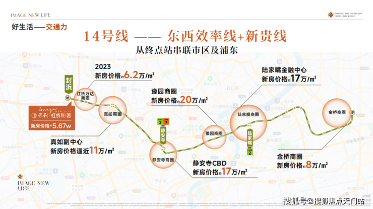 14号线和嘉闵线(在建中)双轨交汇,3站虹桥枢纽,5站普陀,一脉静安。距14号线地铁口仅约200米,步行2分钟即达。作为始发站,通勤有位,30分钟直达静安寺,45分钟抵达陆家嘴。同时相较沿线动辄10万+的房价,本项目“5”字头单价,堪称“外环外的预算,中环级的享受”。