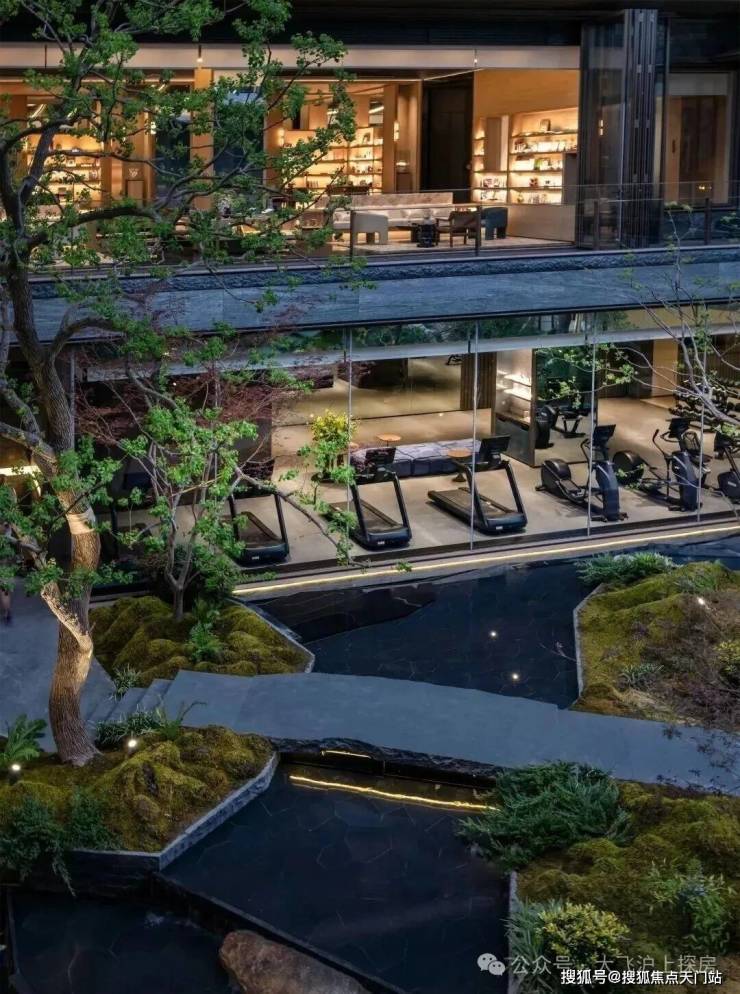 地下区域的健身房直面庭院景观,每台跑步机都正对玻璃中轴,满足"强迫症"用户的极致体验;