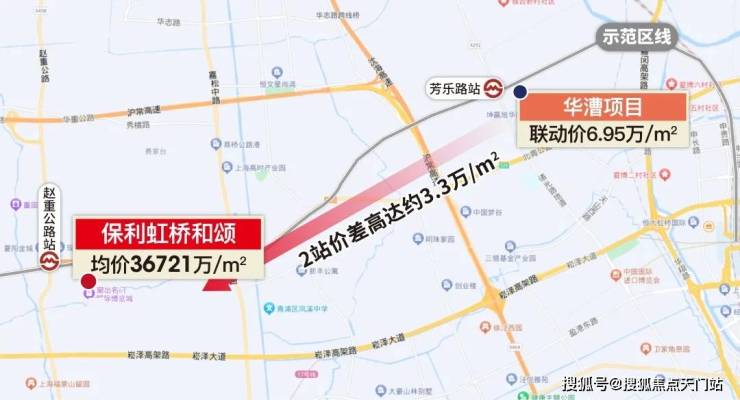 一方面,沿着示范区线2站外的华漕已 6.95万/㎡,1站外的华新 4.75万/㎡,这样的差价在全市都极为少有。