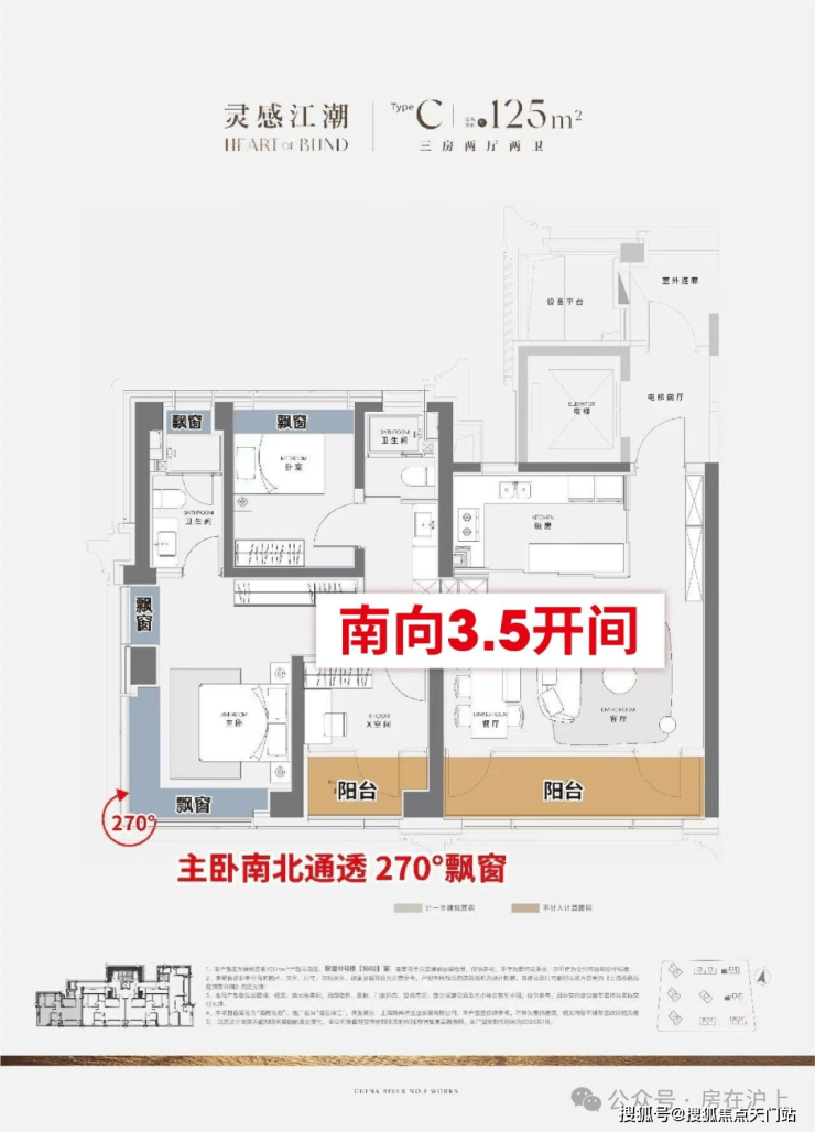边套125㎡户型,南向3.5开间+双阳台+270°转角飘窗,让该户型的采光性能、空间通透感几乎做到极致。
