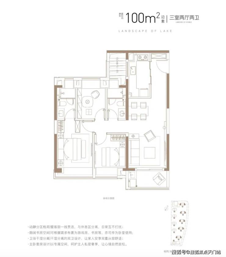 三开间朝南+主卧套房设计+动静分离+全卧室带飘窗,功能性和尺度感完美结合的3房,能满足业主从二人世界到三口之家,再到二胎家庭的全生命周期需求。