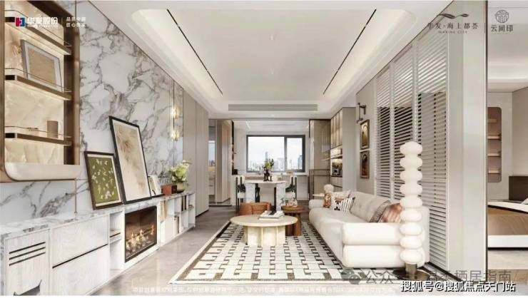 六重·澜亭之奢,约15米漂浮客厅。作为东赏水院灵韵,南望艺境连廊的观景中心,采用威尼斯棕岩板纹理,搭配金属、质感墙面,会客之中尽享艺术精粹尽显奢阔气度。成就高端私密会客的理想之境,融汇自然与艺术精粹。