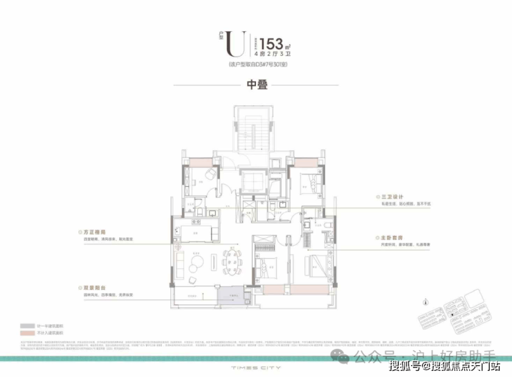 中平户型以四开间朝南的IMAX级采光面,打造出堪比市区豪宅的尺度感。4房4飘窗2阳台的设计,配合双套房布局,一共有三个套房,让每个家庭成员都享有独立私密空间。
