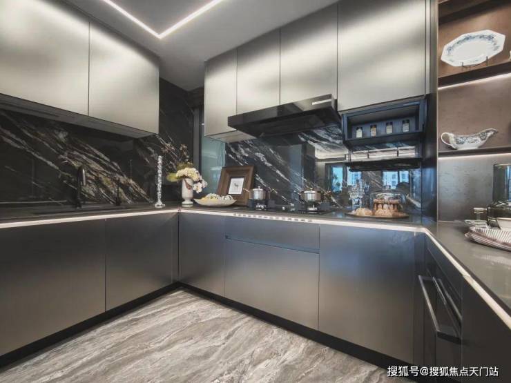 厨房采用U型动线,操作空间比较足,石英石的台面,柜体用了比较时尚的金属色泽材料,整体更具通透性和科技感。厨房北向利用赠送飘窗设置约650深度的加宽台面,定制了古驰黑岩板!