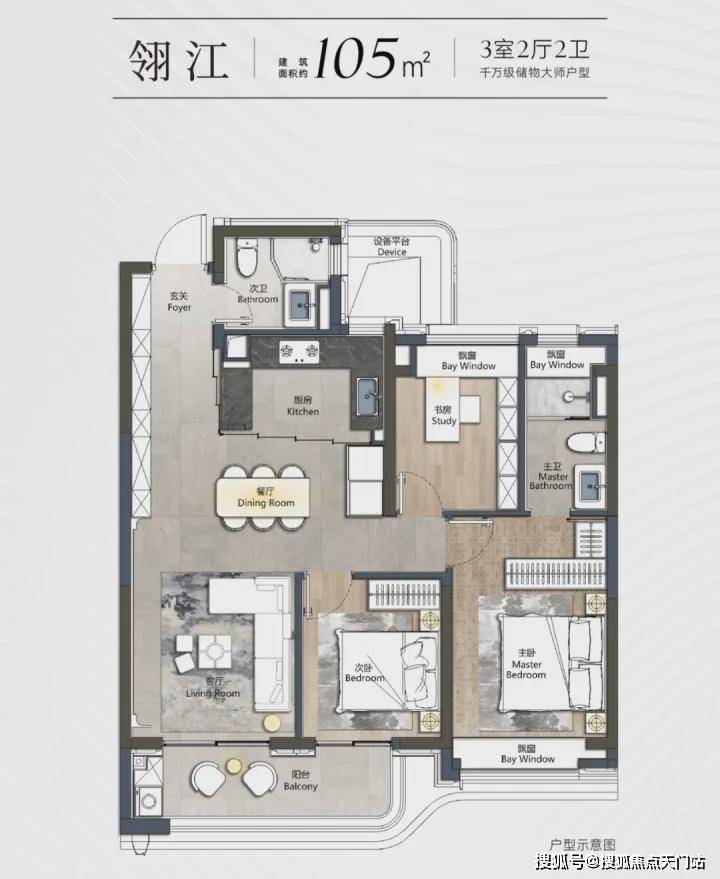 建面约105平的户型,3房2厅2卫的动静分离格局,典型的三开间朝南户型,双阳台布局,南向采光面宽约9.4m,多屋飘窗设计,南北通透,空间利用率较同类产品提升约15%!