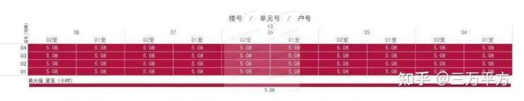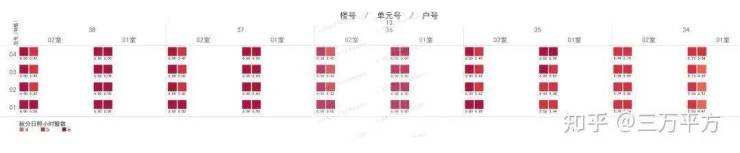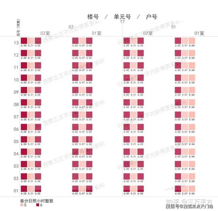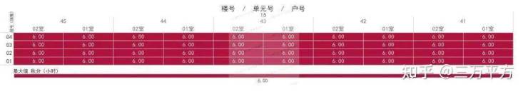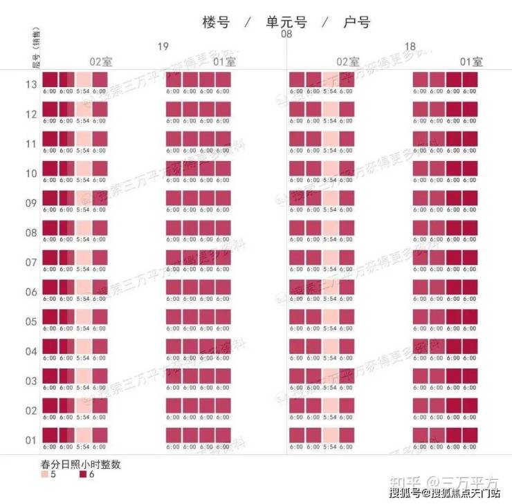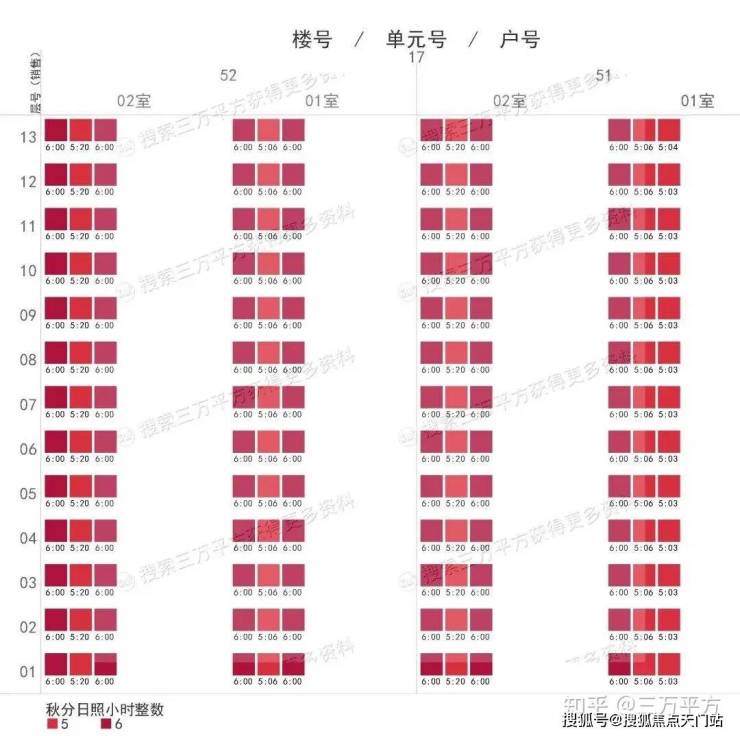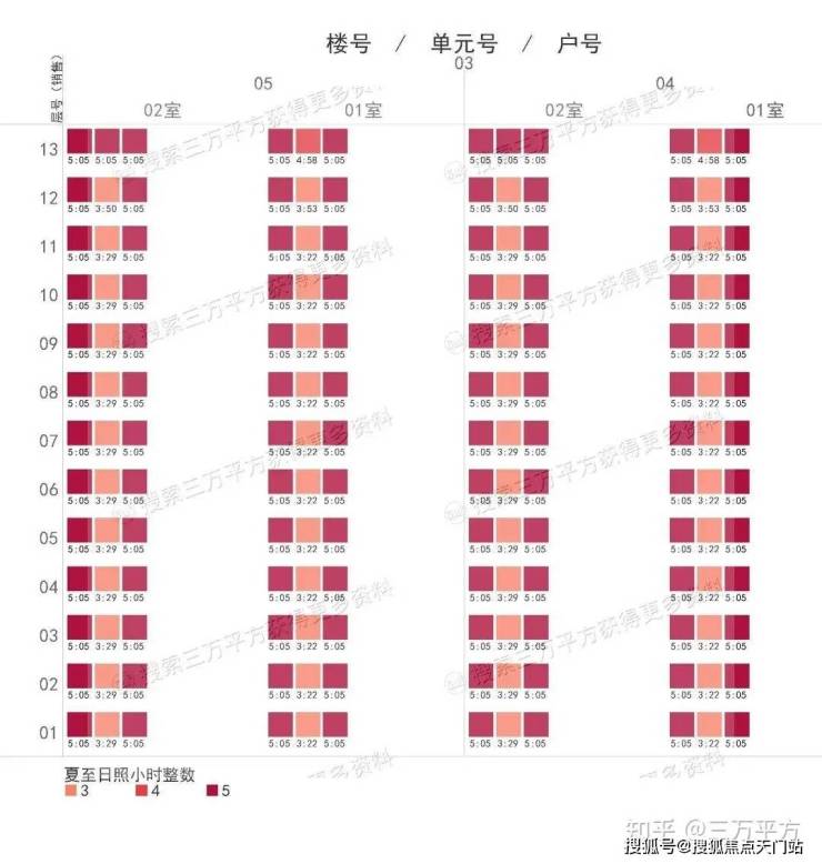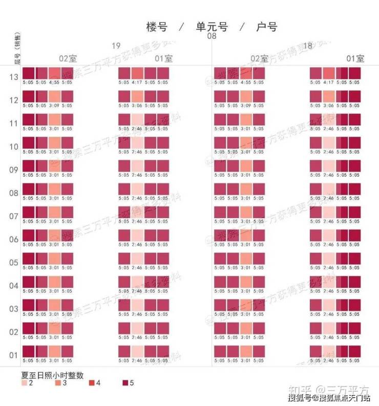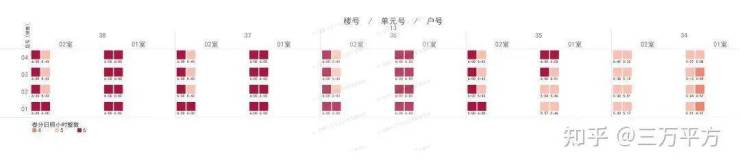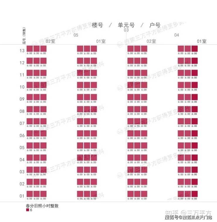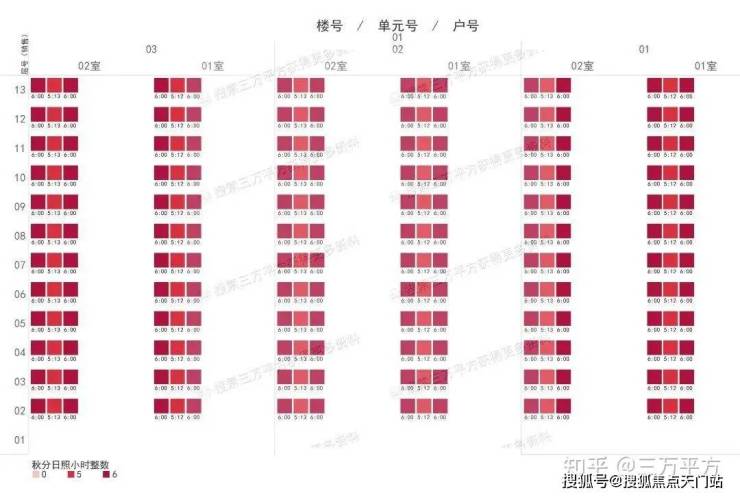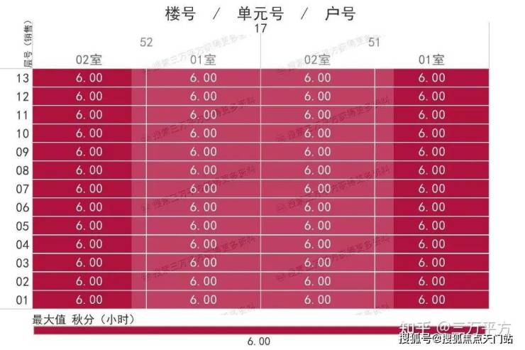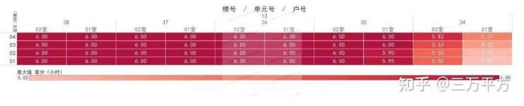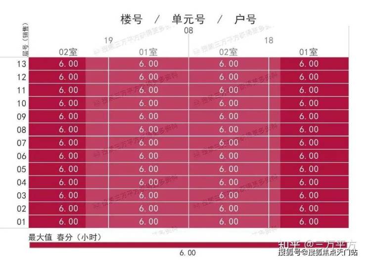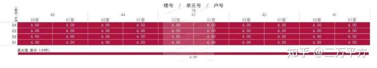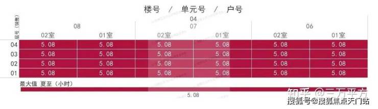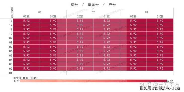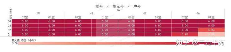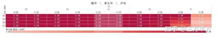 下面是每栋楼每户的日照时间。这是每一户的时间数据,是该户所有南向房间里日照时间最长的数据。可以通过这个来快速挑选和对比自己心意的户型。