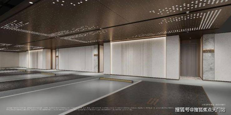 汽车坡道采用氛围照明,搭配星空顶造型彰显独特。玄关空间以线条灯光、地面环氧磨石、星空顶及柱面石材等,提升业主归家仪式感及空间品质感。