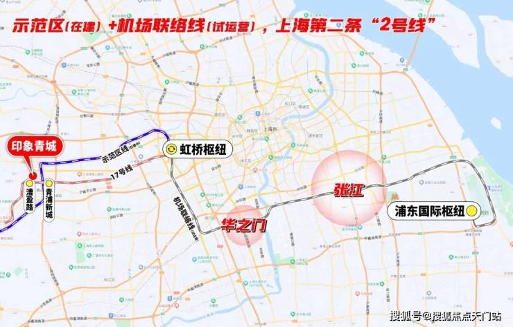 但这还不是全部,17号线+示范区线 左手长三角一体化、华为,右手前湾、大虹桥总部商办,并通过虹桥枢纽,串联2号线及正在试运营的机场联络线, 把市中心、徐汇、闵行、张江等高能板块都纳入印象青城的通勤版图。