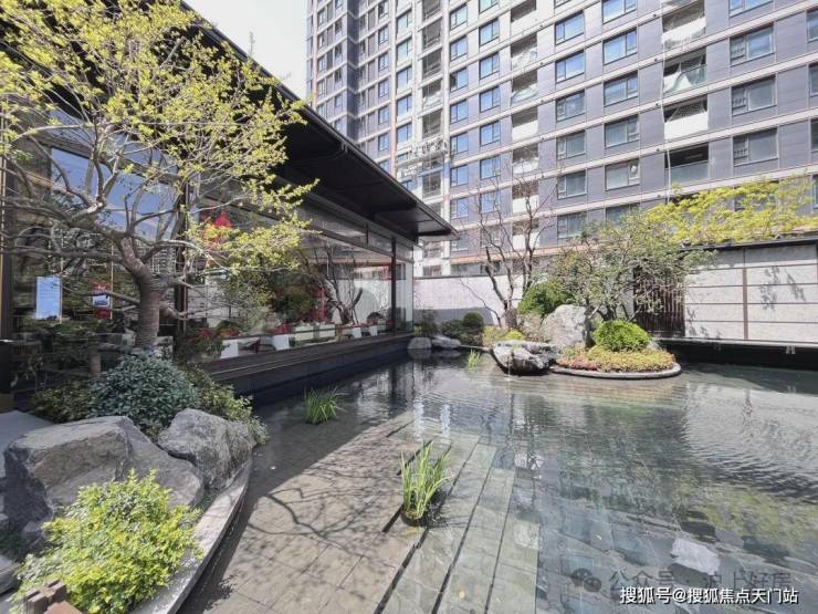 一条清韵石径,挑选造型独特的石头、三两组合成景,搭配特选的造型植物,极具艺术美感。而清泉石流景墙背后,就是未来业主的生活区。