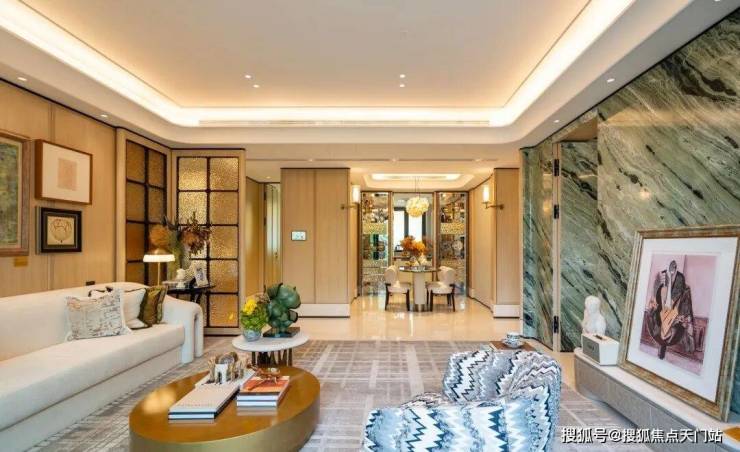 例如入户玄关铺设有“石材皇后”鱼肚印象,这种级别的奢石在很多项目中通常仅作局部镶嵌。