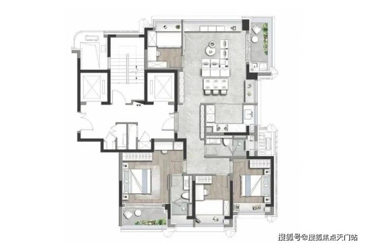 主卧套房设计,带双台盆卫生间;三个次卧可以后期利用阳台或飘窗,延展使用。据第三方测算,阳台与飘窗的赠送面积合计达到约20㎡,面积实得率高达近90%!
