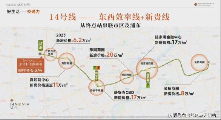 14号线和嘉闵线(在建中)双轨交汇,3站虹桥枢纽,5站普陀,一脉静安。距14号线地铁口仅约200米,步行2分钟即达。作为始发站,通勤有位,30分钟直达静安寺,45分钟抵达陆家嘴。同时相较沿线动辄10万+的房价,本项目“5”字头单价,堪称“外环外的预算,中环级的享受”。