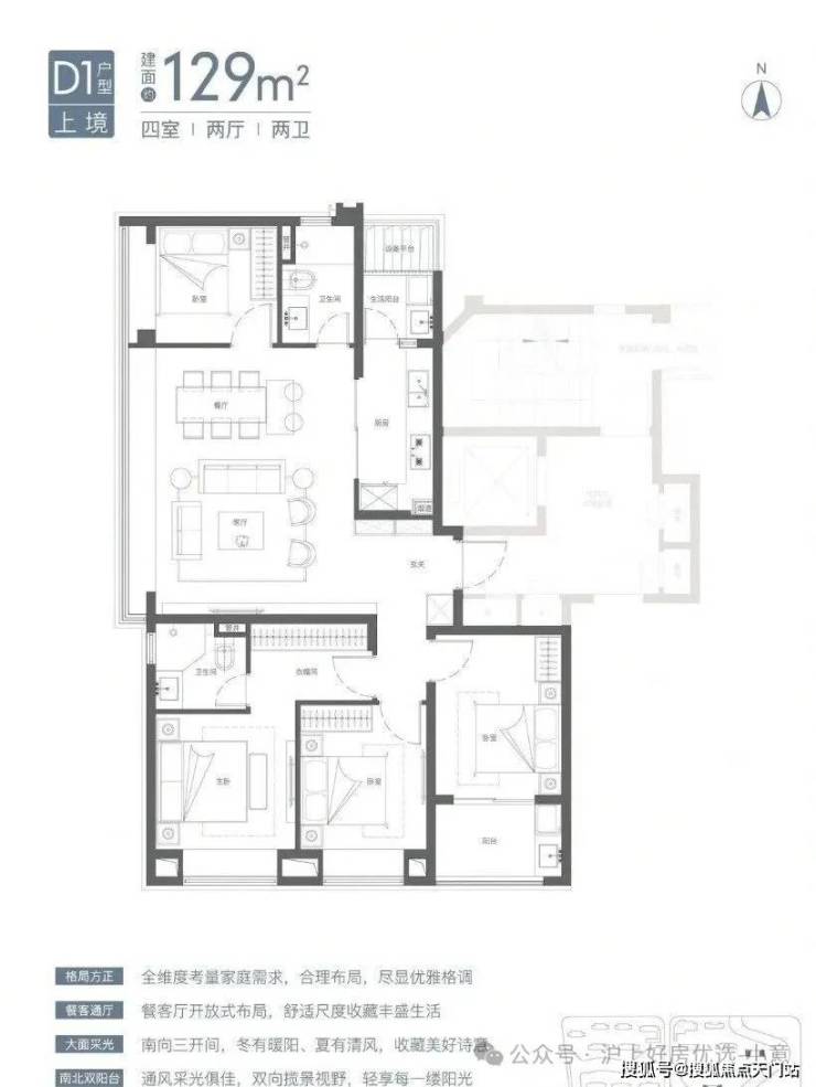 U型厨房、餐厅、客厅、阳台一线联通,南北通透。主卧套房、全卧飘窗、次卫干湿分离也都是标配。