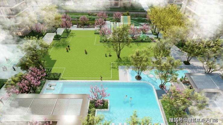 社区规划格局采用中轴对称,内部有室外游泳池、景观廊道和中心大花园,部分楼栋设置架空层,建筑里面以非对称形式的设计手法,打造现代化理念。