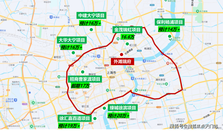 今年六批次土拍,绿城竞得北外滩新宅地,溢价率超过46%,未来售价预计突破20万元,它的位置就在「外滩瑞府」东侧约1KM。