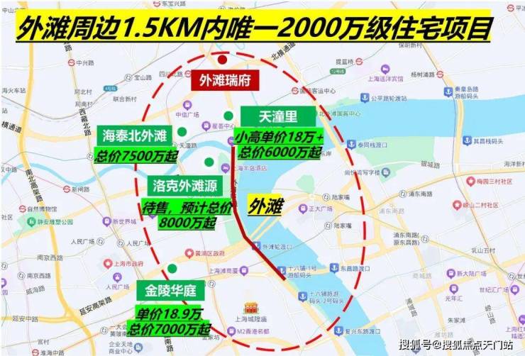 比如金陵华庭,步行到外滩约1公里,和「外滩瑞府」到外白渡桥距离相近,单价直奔19万元/㎡。