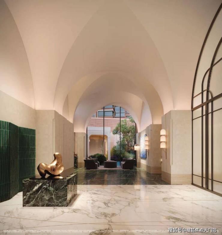 进入之后,通过酒店式入户大堂衔接艺术感极强的全域风雨连廊归家。