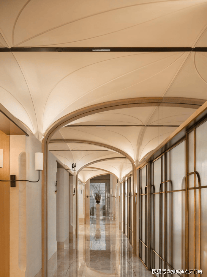 外滩瑞府的2号楼泛会所,正是华润置地深入洞察这份需求后,给出的精准回应。空间由汤臣一品、翠湖六期同款设计师渡边智昭先生操刀,实际呈现的质感不仅还原了设计师的蓝图,更带来超出预期的惊喜。整体空间中,艺术廊道深度融合外滩历史文脉,顶部石材切割出流畅的圆弧转角,与地面弧形线条相互呼应, 行走其间宛如置身艺术展馆,每一步都藏着底蕴,这种经典设计语言让空间越住越耐看,经得起时间考验。