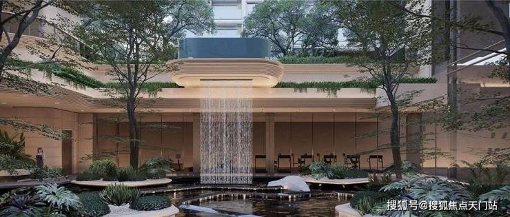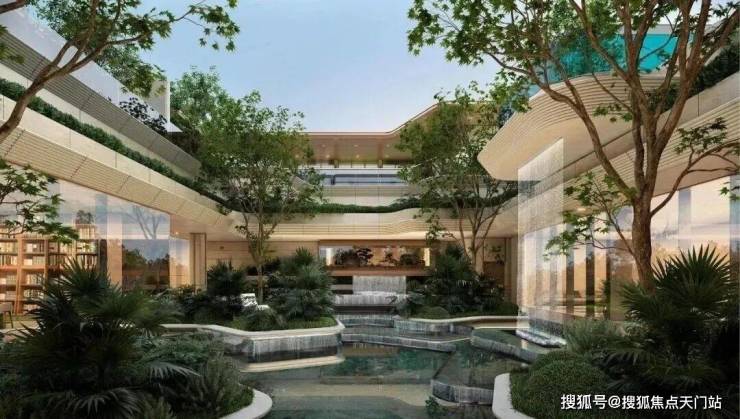 “漂浮的绿洲”,九重层次下沉庭院,区域悬浮泳池+4.3米飞瀑设计 ,塑造极致度假感受,丰富的视觉奇观。