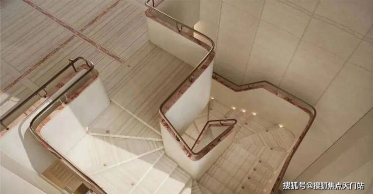 艺术旋转楼梯 进入,整块 白木纹石材切割+宝格丽粉镶边 设计的旋转楼梯,营造社区高雅氛围,步步生花。