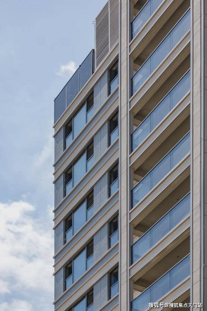 外立面整体形制优雅端正,时尚轻盈,简约有力,横向和竖向金属线条搭配。以简洁现代的线条表达立面感,加上对称的美学,使得建筑整体有着十足的现代感。同时,更大的窗墙比,让每一户的采光都能保持更佳。