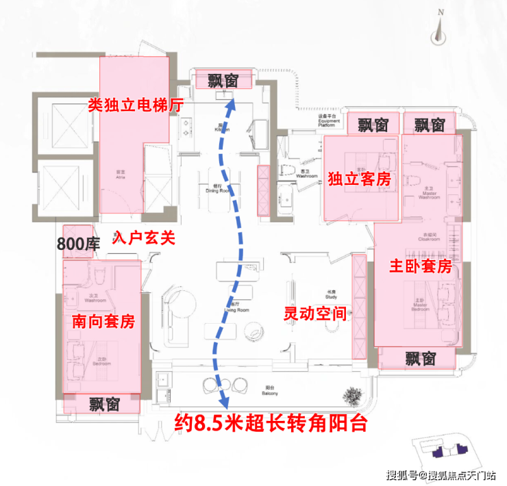 约15.4米宽阔观景面 ,结合自由灵活的洄游动线,并配有 约8.5米宽的大尺度阳台 ,比很多300㎡+顶豪户型都宽阔,采光、景观视野MAX,