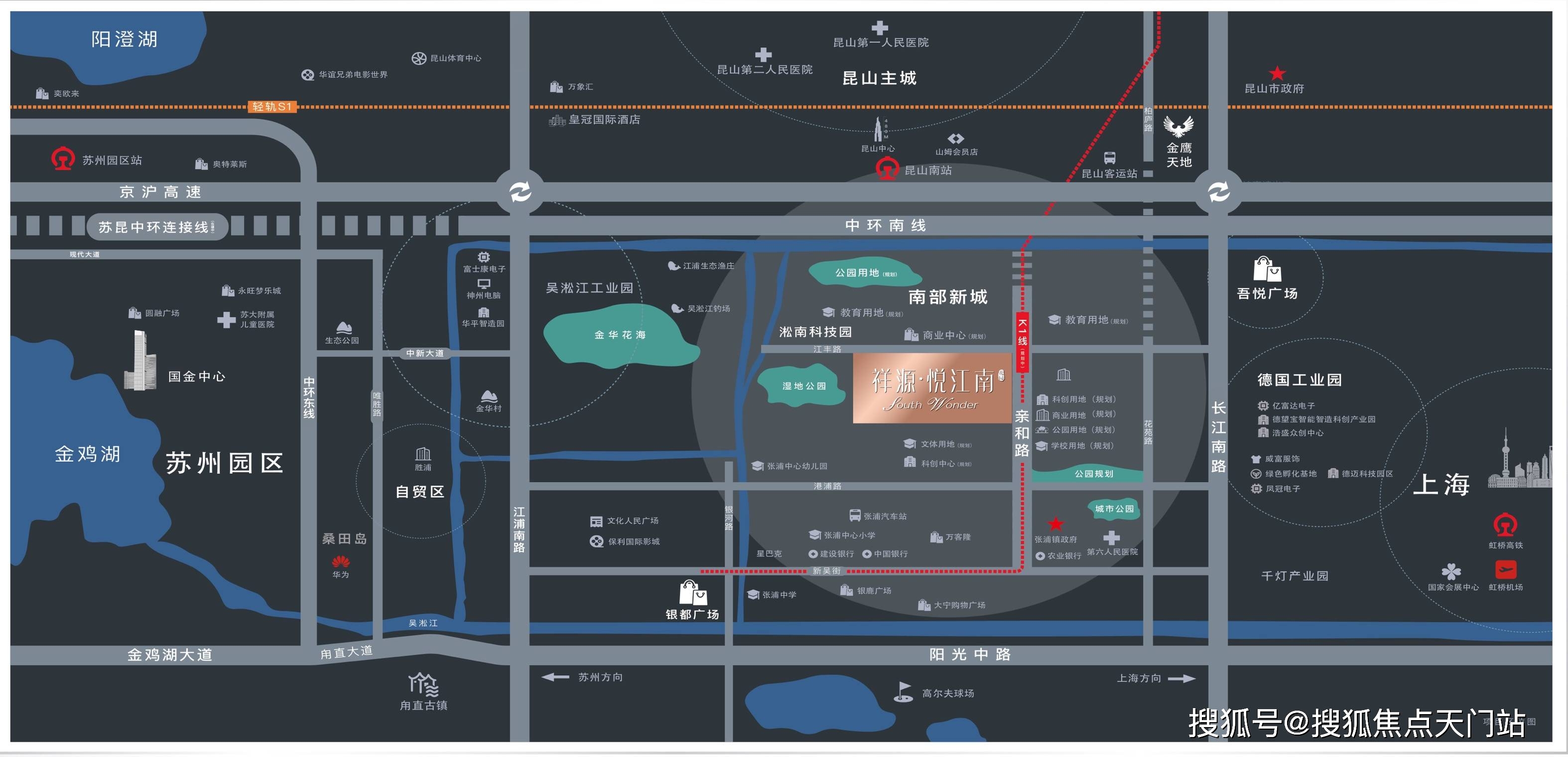 项目处于昆山南部新城,规划中的K1轻轨旁,近享受吾悦广场、银都广场两大购物中心,直面城市级商业规划;约2km内集合张浦中心幼儿园、张浦新昆小学、张浦中心小学等优质教育资源。社区内部融合5大运动场所,6大主题社交空间,带给客户全新都会生活体验。产品涵盖约90-95m2全能三房户型、南北通透格局,户户连体双阳台。