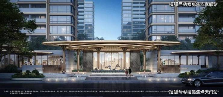 社区门头的设计同样非常有腔调,顶部是大面积弧形金属板,背景是通透玻璃和奢石景墙,对标奢华酒店门庭,营造出豪宅归家仪式感。
