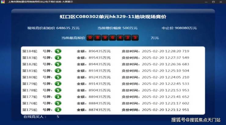 2025年2月,今年第一批次土拍中,经过184轮竞价,金茂&庆隆联合体以总价896435万元竞得虹口C080302单元hk329-11地块,溢价率38.2%,折合楼板价117474元/㎡,装修标准不小于4000元/㎡。
