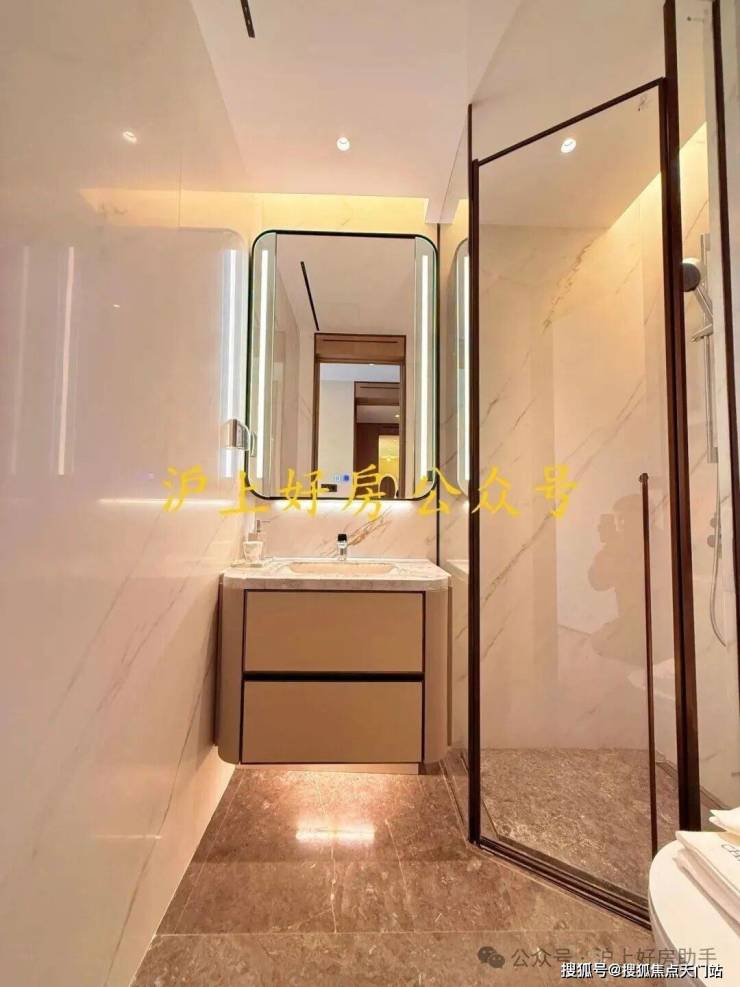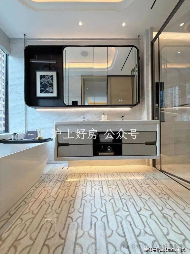 另外,卫生间也是配置拉满,劳芬的马桶、当代的龙头、内置美妆冰箱的镜柜、大理石的地面、江南烟雨奢石的墙面一应俱全!