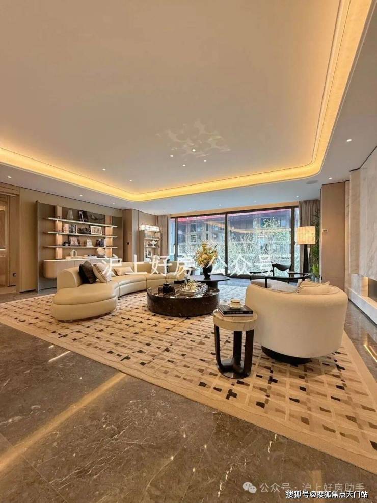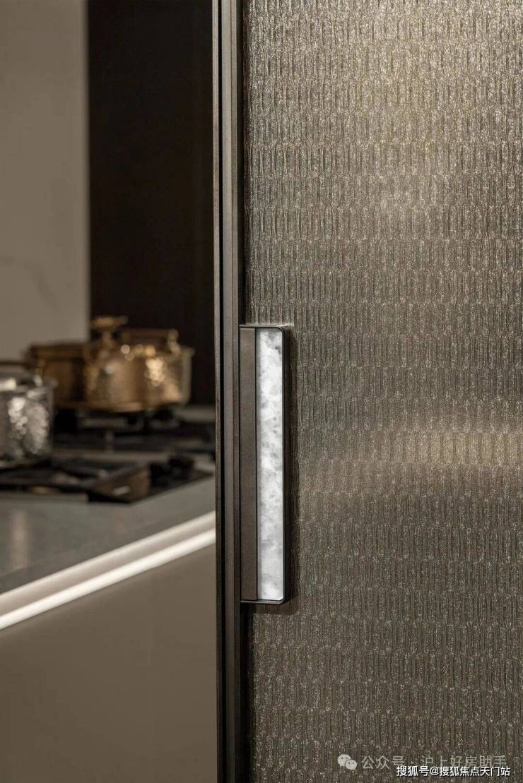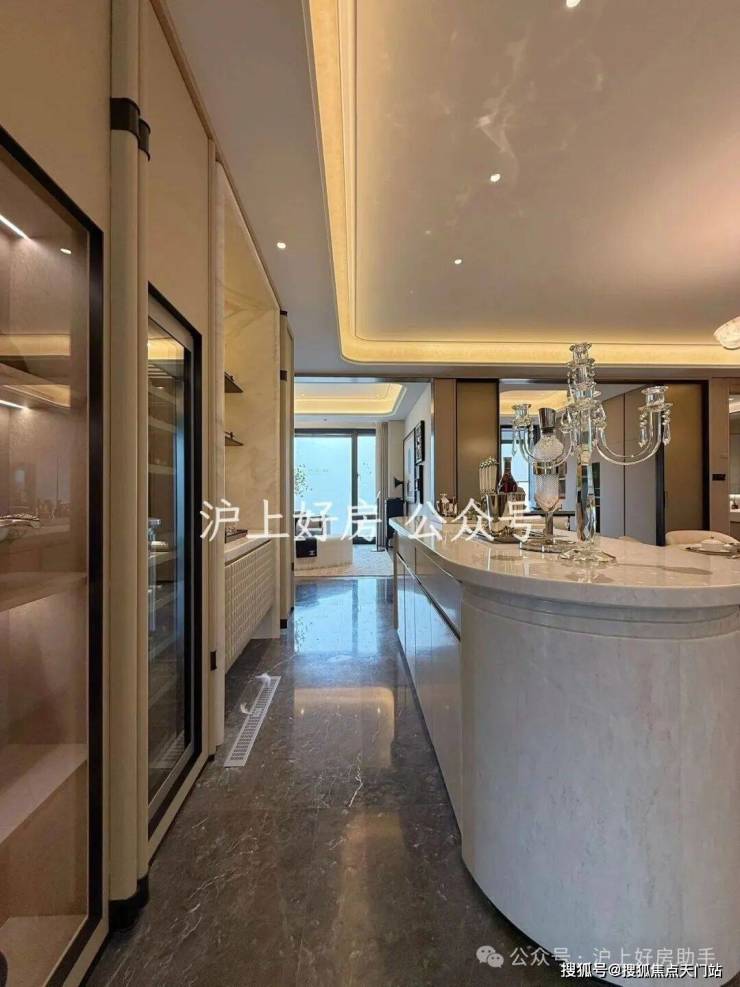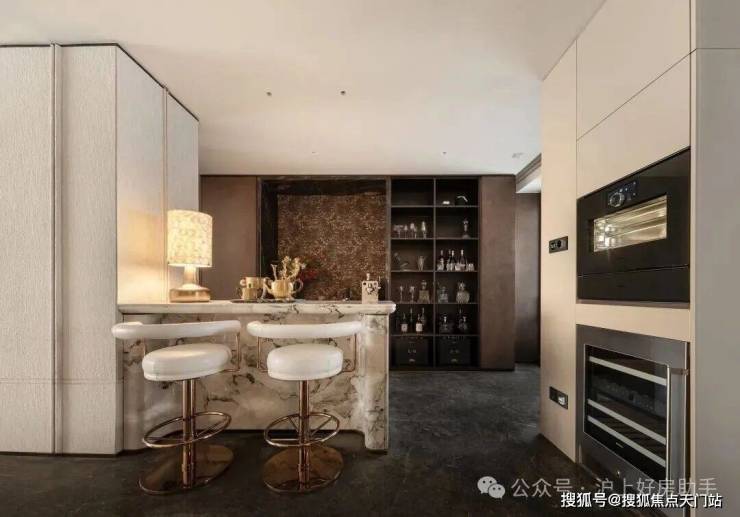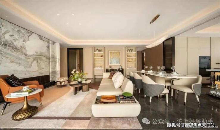 室内大量运用奢石,搭配统一木饰面与皮革材质,通过圆弧设计、隐形出风口、无高差客厨地面等“隐形美学”处理,让奢华与舒适完美融合。